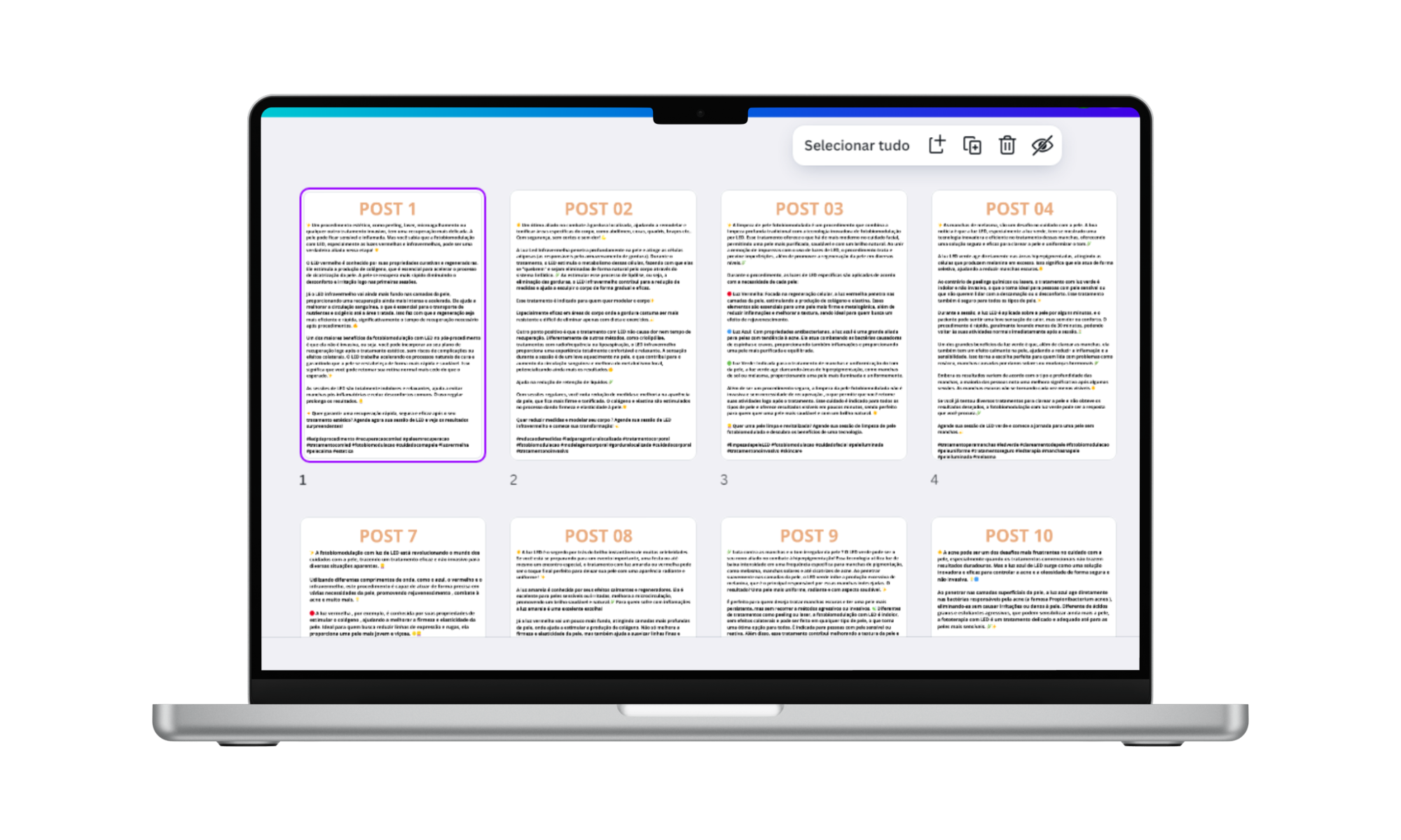Não se preocupe o conteúdo também está pronto! É só copiar as legendas e colar na descrição do post. Texto explicando o assunto ou tratamento, qual led é para cada tratamento etc… Também com chamada para ação e hashitags.